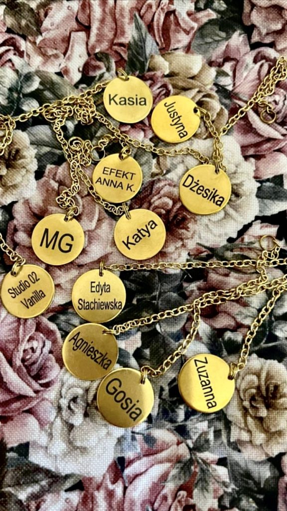 Dyskretny, a jednocześnie bardzo elegancki akcent. Zawieszki są wykonane z metalu w odcieniu złota, z wygrawerowanym imieniem (lub imieniem i stanowiskiem).